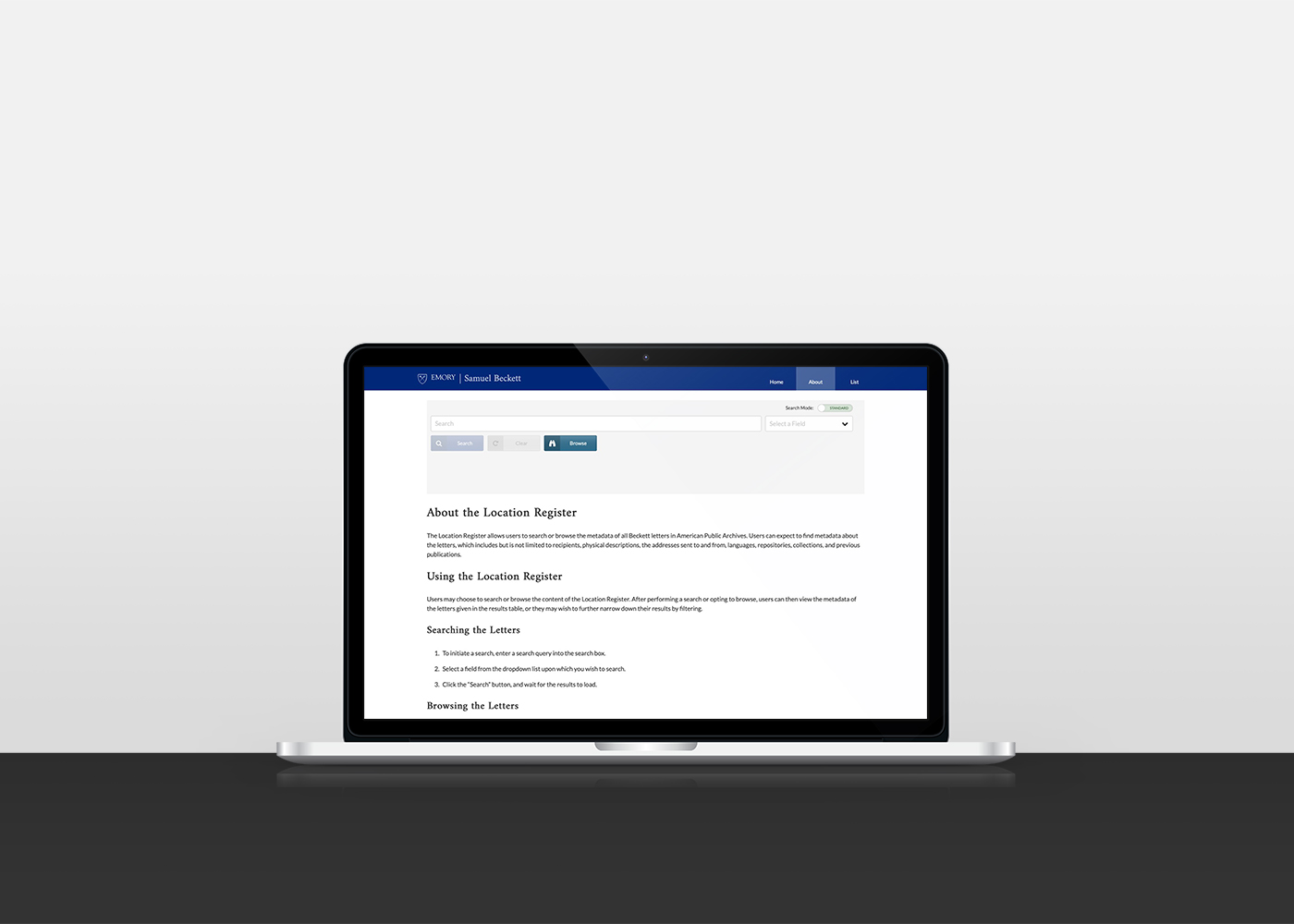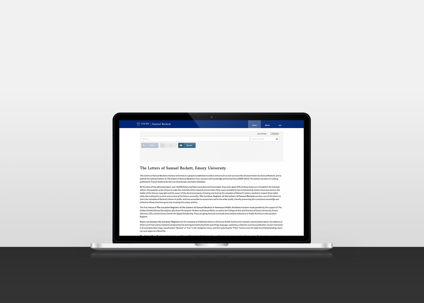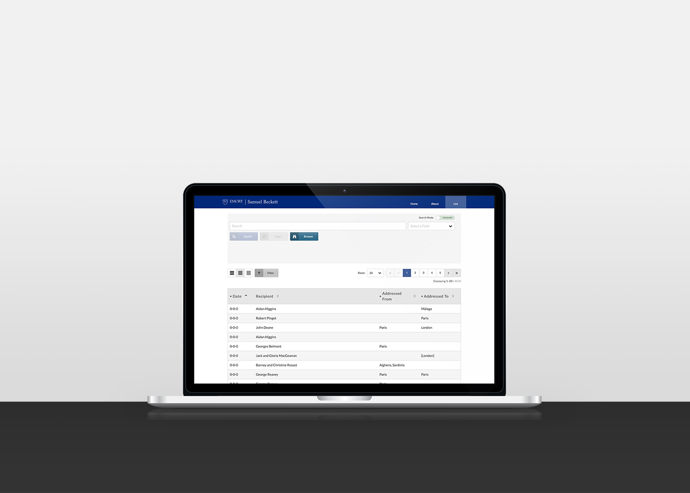 The Emory Center for Digital Scholarship (ECDS) has parterned with many sponsors and grant programs over the years to build an extensive collection of Samuel Beckett's scholarly works with detailed record-keeping included. More recently, ECDS teamed up with Emory Libraries to bring the Beckett Location Register to life: ECDS envisioned a location register that scholars and other literary buffs could leverage in order to browse and otherwise find detailed information about Samuel Beckett's letters with Emory's records. Some of the explicit requirements that were given for the location register included the ability for users to browse, search, filter, and sort through all records. The actual implementation of the location register was left in our hands.